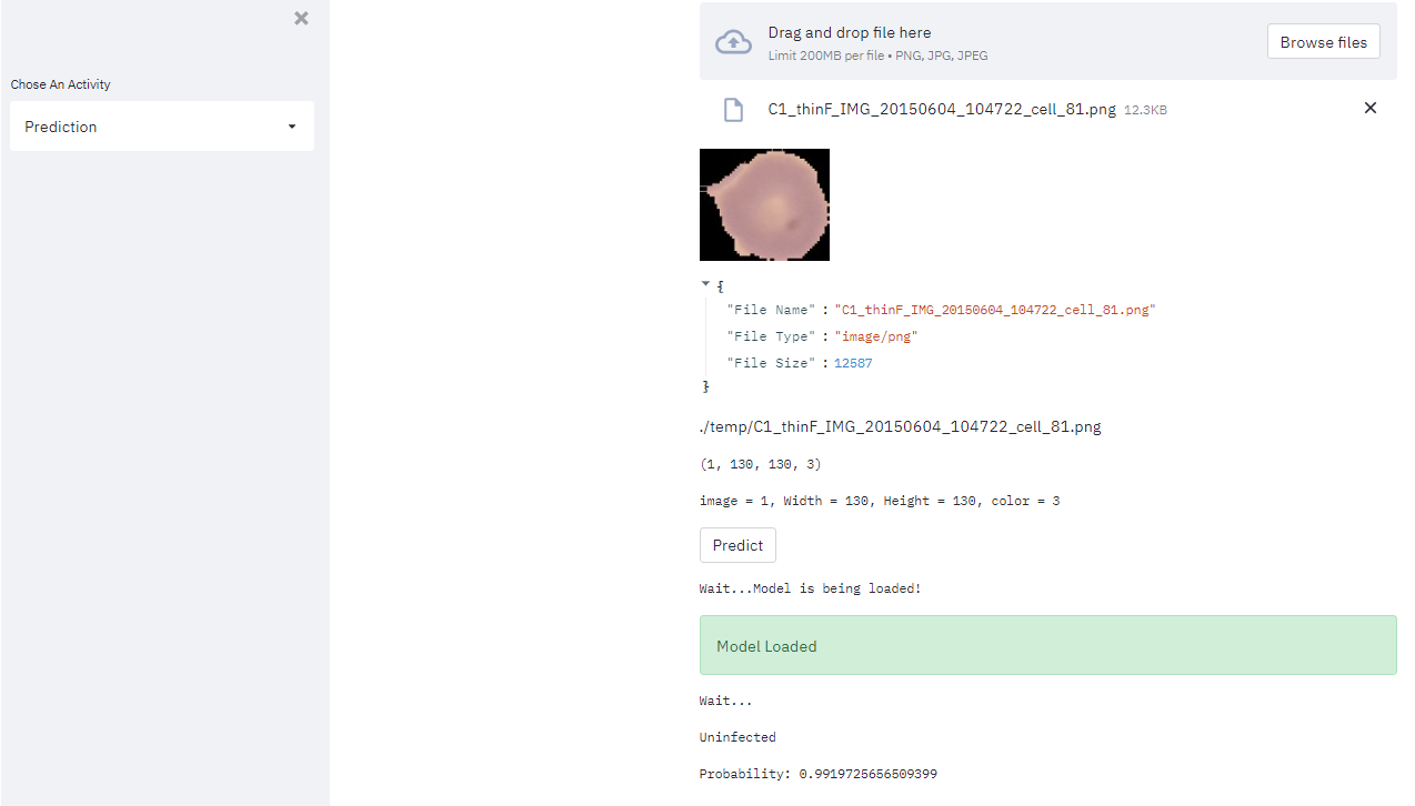 "Infected/Parasitized" or "Uninfected," along with the probability of the prediction.